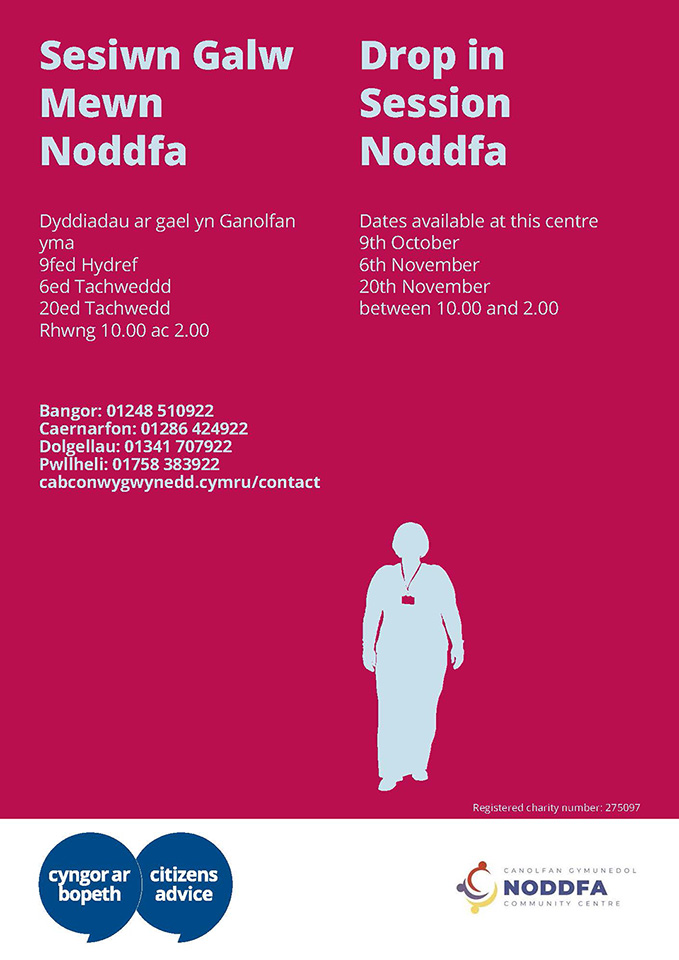 Bydd cynrychiolydd o Cyngor Ar Bopeth yn Noddfa ar y dyddiadau isod o 10yb i 2yh: